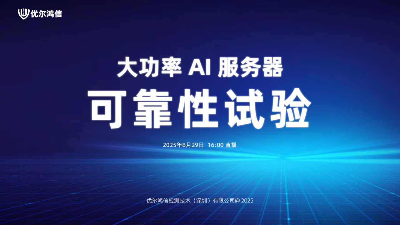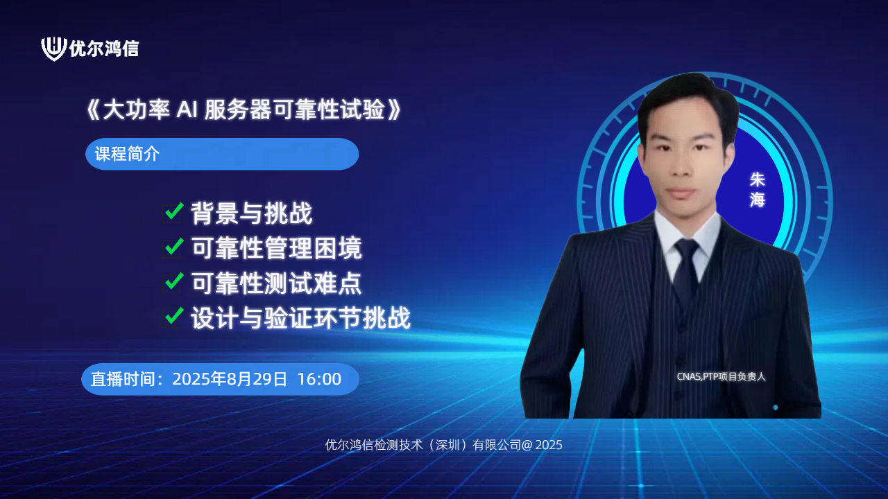 为助行业应对挑战,2025 年 8 月 29 日 16 点,优尔鸿信将举办“大功率 AI Server 可靠性试验简介”网络研讨会。资深工程师朱海将亲临直播间,介绍试验技术应用与发展趋势,答疑解惑。直播间福利丰厚,识别海报二维码即可预约直播、参与抽奖,共探试验奥秘,为智能时代发展助力。